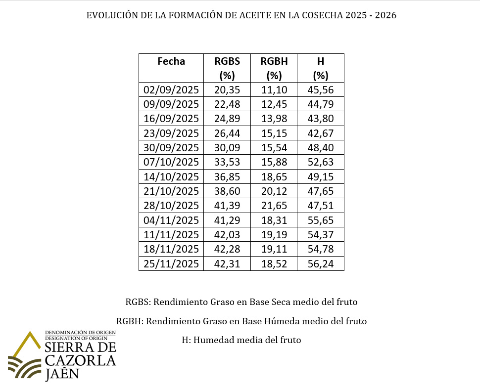 Los datos que el Consejo Regulador de la DOP Sierra de Cazorla anunció el mes pasado, en cuanto a formación de aceite y desarrollo del fruto, se han cumplido. La última semana de octubre fue la última fecha en la que la lipogénesis se mantuvo activa y, a partir de entonces, prácticamente no ha habido una formación de aceite que pueda ser considerable.